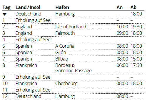 Kreuzfahrt Ärmelkanal & Golf von Biskaya - Westeuropa: Hamburg, Isle of Portland (England), Falmouth (England), La Coruna (Spanien), Gijon (Spanien), Bilbao (Spanien), Bordeaux (Frankreich), Cherbourg (Frankreich), Hamburg (Deutschland)