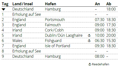 Kreuzfahrt Großbritannien & Irland ab Hamburg: Hamburg, Portsmouth (England), Falmouth (England), Cork (Irland), Dublin (Irland), Fishguard (Wales), Isle of Portland (England), Hamburg (Deutschland)