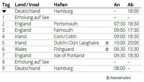 Kreuzfahrt Großbritannien & Irland ab Hamburg: Hamburg (Deutschland), Portsmouth (England), Falmouth (England), Cork (Irland), Dublin (Irland), Fishguard (Wales), Isle of Portland (England), Hamburg,