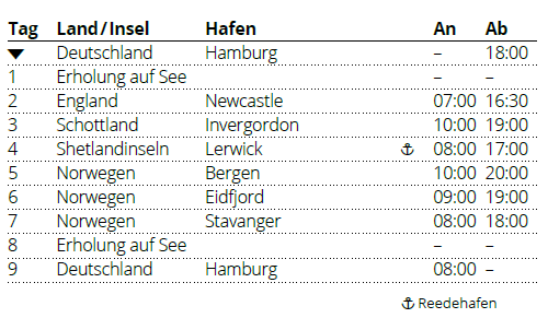Hier finden Sie eine Übersicht aller Hamburg Kreuzfahrten. |
