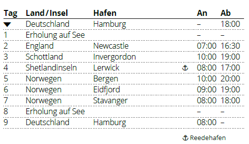 Hier finden Sie eine Übersicht aller Hamburg Kreuzfahrten. |