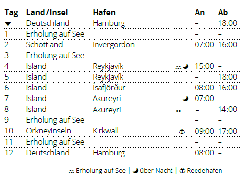 AIDA Island Reise mit AIDAsol Kreuzfahrt auf der Route 'AIDAsol Island-Rundreise ab Hamburg'. AIDAsol vom 27.06.2027 bis 09.07.2027 für 12 Tage ab/bis Hamburg. AIDAsol am 27. Juni 2027 auf Kreuzfahrt nach Island mit Orkneyinseln und Invergordon in Schottland.