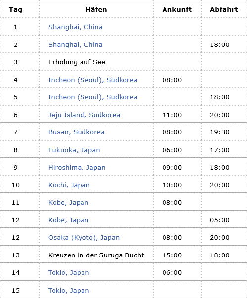 Kreuzfahrt China, Südkorea & Japan 1: Shanghai (China), Incheon (Südkorea), Jeju Island (Südkorea), Busan (Südkorea), Fukuoka (Japan), Hiroshima (Japan), Kochi (Japan), Kobe (Japan), Osaka (Japan), Tokio (Japan)