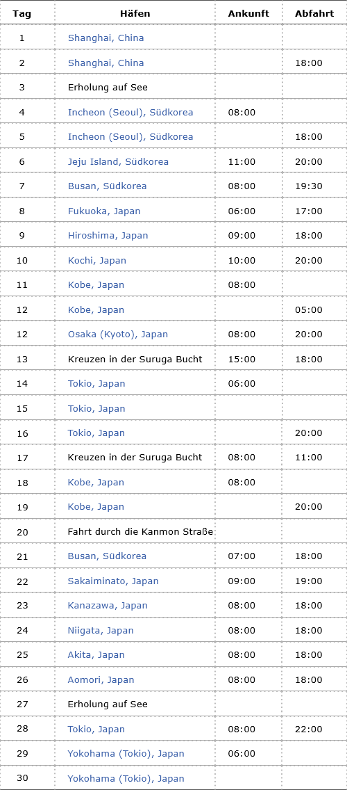 Kreuzfahrt China, Südkorea & Japan zur Frühlingsblüte: Shanghai (China), Incheon (Südkorea), Jeju (Südkorea), Busan (Südkorea), Fukuoka (Japan), Hiroshima (Japan), Kochi (Japan), Kobe (Japan), Osaka (Japan), Tokio (Japan), Kobe (Japan), Busan (Südkorea), Sakaiminato (Japan), Kanazawa (Japan), Niigata (Japan), Akita (Japan), Aomori (Japan), Tokio (Japan), Yokohama-Tokio (Japan)