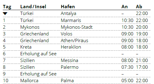 AIDA Reisen mit AIDAstella Kreuzfahrt auf der Route 'AIDA Griechenland & Italien ab Antalya'. AIDAstella vom 13.10.2025 bis 23.10.2025 für 10 Tage ab Antalya bis Mallorca. AIDAstella am 13. Oktober 2025 im östlichen und westlichen Mittelmeer.
