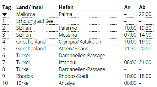 Kreuzfahrt Italien & Griechenland mit Istanbul: Palma de Mallorca, Palermo (Sizilien), Messina (Sizilien), Katakolon (Griechenland), Athen (Griechenland), Istanbul (Türkei), Insel Rhodos, Antalya (Türkei)