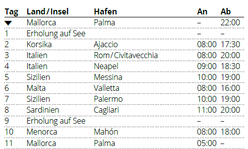Kreuzfahrt Italien & Mittelmeerinseln ab Mallorca: Palma de Mallorca, Ajaccio (Korsika), Civitavecchia (Rom), Neapel (Italien), Messina (Sizilien), La Valletta (Malta), Palermo (Sizilien), Cagliari (Sardinien), Mahon (Menorca), Palma de Mallorca