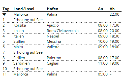 Kreuzfahrt Italien & Mittelmeerinseln: Palma de Mallorca, Ajaccio (Korsika), Civitavecchia (Rom), Neapel (Italien), Messina (Sizilien), La Valletta (Malta), Palermo (Sizilien), Cagliari (Sardinien), Palma de Mallorca