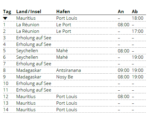 AIDA Reisen mit AIDAstella Kreuzfahrt auf der Route 'AIDA Mauritius, Seychellen & Madagaskar 1'. AIDAstella am 10. Dezember 2025, 24. Dezember 2025 und 18. Februar 2026 für 14 Tage ab/bis Port Louis auf Mauritius. AIDAstella am 10.12.2025, 24.12.2025 und 18.02.2026 im Indischen Ozean.