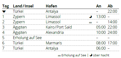 Antalya (Türkei), Limassol (Zypern), Port Said (Ägypten), Alexandria (Ägypten), Marmaris (Türkei), Antalya (Türkei)