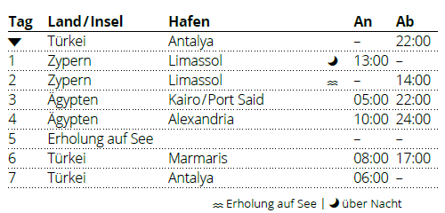Sehr kurzweilig ist auch ein Besuch der geteilten Hauptstadt Nikosia, wo griechisch-orthodoxe Kirchen, islamische Gebetshäuser, lebendige Märkte und der historische Stadtkern warten.Das hügelig-zerklüftet Inselinnere mit seinen kleinen Siedlungen, wo seit Jahrhunderten Weinbau und Landwirtschaft betrieben wird, lässt sich auf Schusters Rappen, im Geländewagen oder mit dem Ausflugsbus entdecken. Die glasklaren Gewässer Zyperns laden ein zum Strandbesuch, einer Bootsfahrt oder zum Abtauchen mit der Aida Divingcrew und alle Golfer oder Radfahrer können hier ebenso ihrer Leidenschaft frönen.