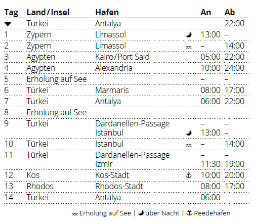 Kreuzfahrt Östliches Mittelmeer mit Ägypten & Istanbul: Antalya (Türkei), Limassol (Zypern), Port Said (Ägypten), Alexandria (Ägypten), Marmaris (Türkei), Antalya (Türkei), Istanbul (Türkei), Izmir (Türkei), Insel Kos, Insel Rhodos, Antalya (Türkei)