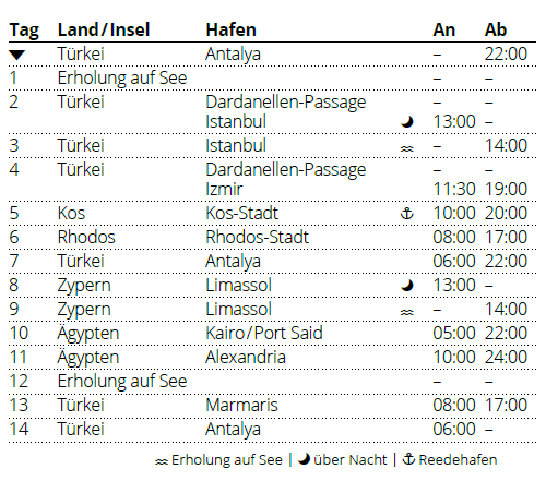 Kreuzfahrt Östliches Mittelmeer mit Istanbul & Ägypten: Antalya (Türkei), Istanbul (Türkei), Izmir (Türkei), Insel Kos, Insel Rhodos, Antalya (Türkei), Limassol (Zypern), Port Said (Ägypten), Alexandria (Ägypten), Marmaris (Türkei), Antalya (Türkei)