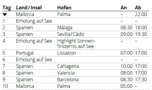 Kreuzfahrt Spanien & Portugal mit Sonnenfinsternis: Palma de Mallorca, Malaga (Spanien), Cadiz (Spanien), Highlight Sonnenfinsternis auf See, Lissabon (Portugal), Cartagena (Spanien), Valencia (Spanien), Barcelona (Spanien), Palma de Mallorca