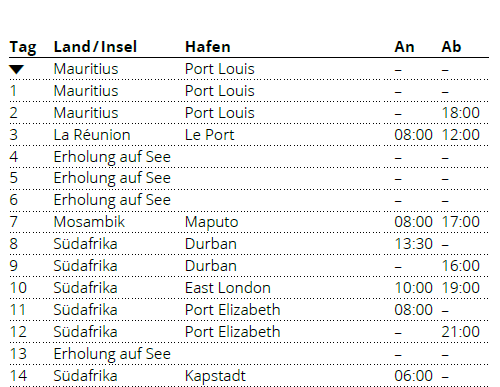 Kreuzfahrt Südafrika mit La Réunion & Mauritius 1: Port Louis (Mauritius), Reunion, Maputo (Mosambik), Durban (Südafrika), East London (Südafrika), Port Elizabeth (Südafrika), Kapstadt (Südafrika)