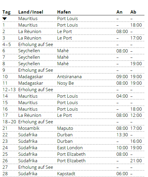 AIDA Indischer Ozean und Südafrika Reise mit AIDAstella Kreuzfahrt auf der Route 'AIDA Südafrika, Seychellen, Mauritius & Madagaskar 1'. AIDAstella vom 23.12.2025 bis 20.01.2026 für 28 Tage ab Port Louis auf Mauritius bis Kapstadt in Südafrika . AIDAstella am 23. Dezember 2025 im Indischen Ozean und in Südafrika.