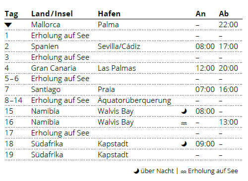 Kreuzfahrt Von Mallorca über Namibia nach Kapstadt: Palma de Mallorca, Cadiz (Spanien), Gran Canaria, Santiago (Kapverden), Walvis Bay (Namibia), Kapstadt (Südafrika)