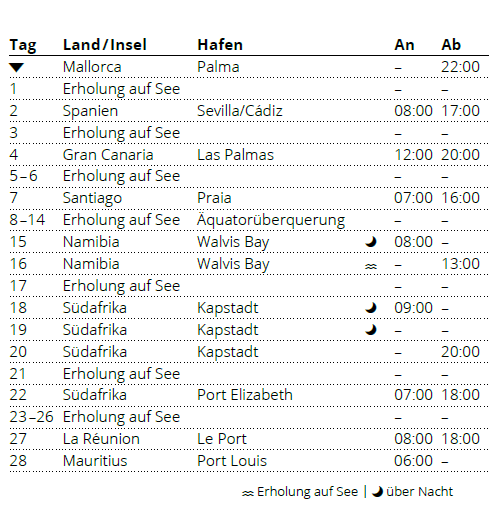 Kreuzfahrt Von Mallorca über Südafrika nach Mauritius: Palma de Mallorca, Cadiz (Spanien), Gran Canaria, Santiago (Kapverden), Walvis Bay (Namibia), Kapstadt (Südafrika), Port Elizabeth (Südafrika), La Reunion, Port Louis (Mauritius)