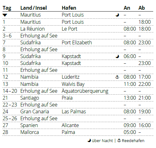 Kreuzfahrt Von Mauritius über Afrika nach Mallorca: Port Louis (Mauritius), La Reunion, Port Elizabeth (Südafrika), Kapstadt (Südafrika), Lüderitz (Namibia), Walvis Bay (Namibia), Praia (Kapverden), Gran Canaria, Alicante (Spanien), Palma de Mallorca