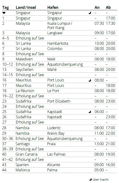 Kreuzfahrt Weltenbummler von Singapur nach Mallorca: Singapur, Kuala Lumpur (Malaysia), Langkawi (Malaysia), Hambantota (Sri Lanka), Colombo (Sri Lanka), Male (Malediven), Mahe (Seychellen), Port Louis (Mauritius), La Reunion, Port Elizabeth (Südafrika), Kapstadt (Südafrika), Lüderitz (Namibia), Walvis Bay (Namibia), Praia (Kapverden), Gran Canaria, Alicante (Spanien), Palma de Mallorca