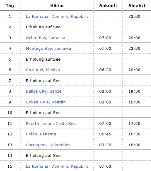 Kreuzfahrt Best of Mittelamerika ab/bis La Romana: La Romana (Dominikanische Republik), Ocho Rios (Jamaika), Montego Bay (Jamaika), Cozumel (Mexiko), Belize, Insel Roatan (Honduras), Puerto Limon (Costa Rica), Colon (Panama), Cartagena (Kolumbien), La Romana (Dominikanische Republik)