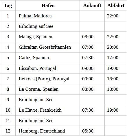 Kreuzfahrt Europas Westküste: Palma de Mallorca, Malaga (Spanien), Gibraltar, Cadiz (Spanien), Lissabon (Portugal), Porto (Portugal), La Coruna (Spanien), Le Havre (Frankreich), Hamburg