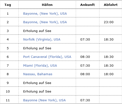 Kreuzfahrt Florida und Bahamas: Bayonne (New York/USA), Norfolk (USA), Port Canaveral (USA), Miami (Florida), Nassau (Bahamas), Bayonne (New York/USA)