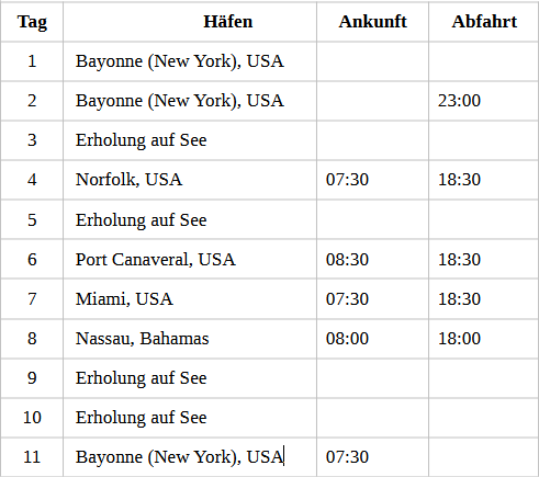 Kreuzfahrt Florida und Bahamas: Bayonne (New York/USA), Norfolk (USA), Port Canaveral (USA), Miami (USA), Nassau (Bahamas), Bayonne (New York/USA)