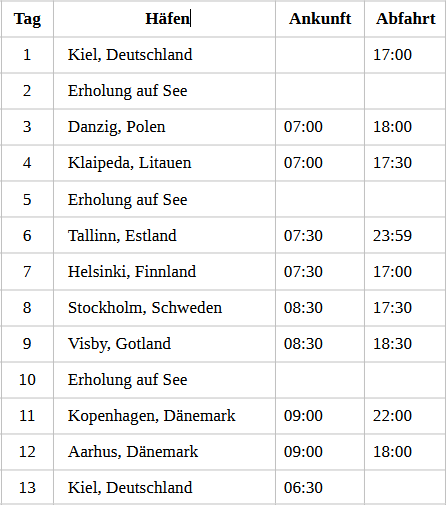 Kreuzfahrt Ostsee intensiv: Kiel, Danzig (Polen), Klaipeda (Litauen), Tallinn (Estland), Helsinki (Finnland), Stockholm (Schweden), Visby (Insel Gotland), Kopenhagen (Dänemark), Aarhus (Dänemark), Kiel
