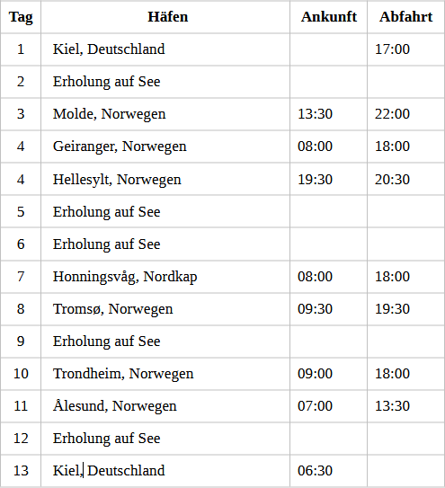 Kreuzfahrt Sommerzauber in Norwegen: Kiel (Deutschland), Molde (Norwegen), Geiranger (Norwegen), Honningsvag (Nordkap), Tromsö (Norwegen), Trondheim (Norwegen), Alesund (Norwegen), Kiel