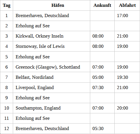 Kreuzfahrt Großbritanniens Schätze: Bremerhaven (Deutschland), Kirkwall (Orkney Inseln), Stornoway (Isle of Lewis), Greenock (Schottland), Belfast (Nordirland), Liverpool (England), Southampton (England), Bremerhaven (Deutschland)