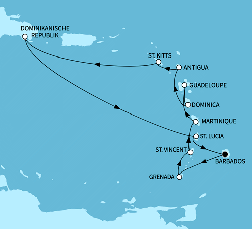 Kreuzfahrt Karibische Inseln ab/bis Bridgetown: Bridgetown (Barbados), Grenada, St. Vincent, Martinique, Guadeloupe, Dominica, Antigua, St. Kitts, La Romana (Dominikanische Republik), St. Lucia, Bridgetown (Barbados)