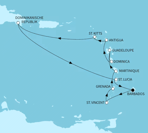 Kreuzfahrt Karibische Inseln ab/bis Bridgetown: Bridgetown (Barbados), St. Vincent, Grenada, Martinique, Guadeloupe, Dominica, Antigua, St. Kitts, La Romana (Dominikanische Republik), St. Lucia, Bridgetown (Barbados)