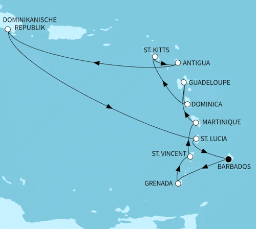 Kreuzfahrt Karibische Inseln ab/bis Bridgetown: Bridgetown (Barbados), Grenada, Kingstown (St. Vincent), Martinique, Guadeloupe, Dominica, Antigua, St. Kitts, La Romana (Dominikanische Republik), St. Lucia, Bridgetown (Barbados)
