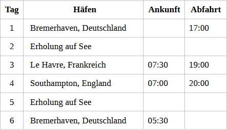 Bremerhaven (Deutschland) Bremerhaven liegt an der Wesermündung, dem Tor zur Nordsee und bildet zusammen mit Bremen das Bundesland Freie Hansestadt Bremen. Genießen Sie bei einem Spaziergang durch die Stadt das maritime Flair oder machen sie eine spannende Hafenrundfahrt durch Überseehafen, Containerterminal und Autoterminal. Lohnenswert sind auch ein Abstecher zur im Norden liegenden Lloyd-Werft, der Besuch im interessanten Fischereimuseum und im Historischem Museum Bremerhafen. Allen Freunden der Kreuzfahrt und Seefahrt im Allgemeinen sei ein Besuch im Deutschen Schifffahrtsmuseum ans Herz gelegt. In solch eindrucksvoller Form findet man alles Wissenswerte rund um die Seefahrt an nur wenigen Plätzen weltweit. Und nach dem Museumsbesuch empfehlen wir Ihnen das Restaurationsschiff im alten Hafen, das mit seiner Crew herzhafte maritime Kost auftischt.
