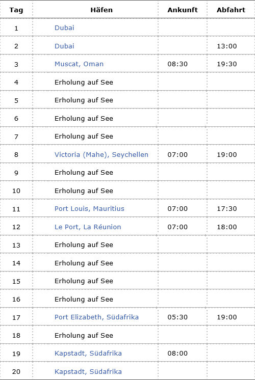 Kreuzfahrt Auszeit zwischen den Kontinenten - Indischer Ozean: Dubai (VAE), Muscat (Oman), Victoria (Seychellen), Port Louis (Mauritius), Le Port (Reunion), Port Elizabeth (Südafrika), Kapstadt (Südafrika)