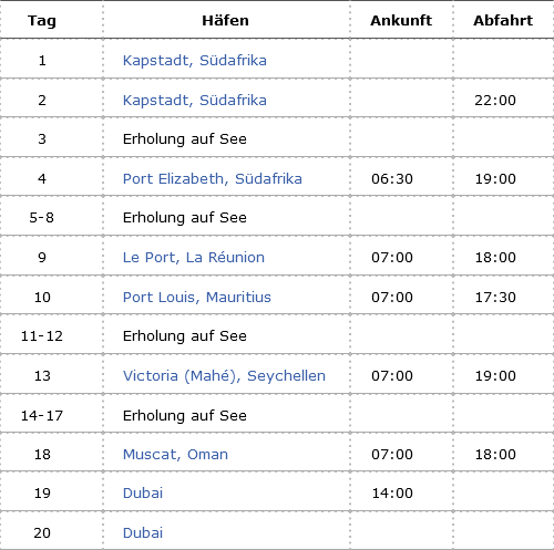 Kreuzfahrt Südafrika, Indischer Ozean und Dubai: Kapstadt (Südafrika), Port Elizabeth (Südafrika), Le Port (Reunion), Port Louis (Mauritius), Mahe (Seychellen), Muscat (Oman), Dubai