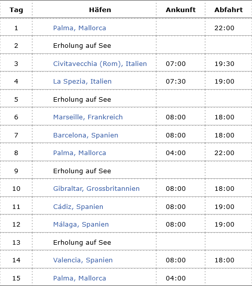 Kreuzfahrt Höhepunkte des westlichen Mittelmeers: Palma de Mallorca, Civitavecchia (Rom), La Spezia (Italien), Marseille (Frankreich), Barcelona (Spanien), Palma de Mallorca, Gibraltar, Cadiz (Spanien), Malaga (Spanien), Valencia (Spanien), Palma de Mallorca