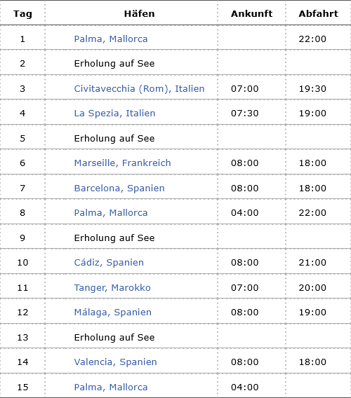 Kreuzfahrt Kulturelle Vielfalt im westlichen Mittelmeer: Palma de Mallorca, Civitavecchia (Rom), La Spezia (Italien), Marseille (Frankreich), Barcelona (Spanien), Palma de Mallorca, Cadiz (Spanien), Tanger (Marokko), Malaga (Spanien), Valencia (Spanien), Palma de Mallorca