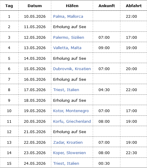 Kreuzfahrt von Mallorca nach Triest: Palma de Mallorca, Palermo (Sizilien), La Valletta (Malta), Dubrovnik (Kroatien), Triest (Italien), Kotor (Montenegro), Insel Korfu, Zadar (Kroatien), Koper (Slowenien), Triest (Italien)
