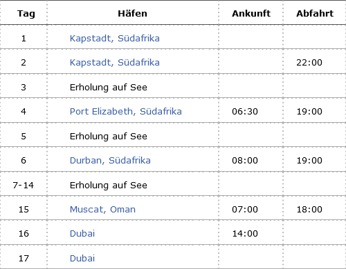 Kreuzfahrt Auszeit zwischen Kontinenten ab Kapstadt bis Dubai: Kapstadt (Südafrika), Port Elizabeth (Südafrika), Durban (Südafrika), Muscat (Oman), Dubai