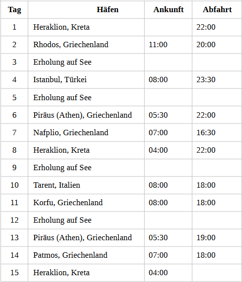 Kreuzfahrt Frühsommer im Östlichen Mittelmeer: Heraklion (Kreta), Insel Rhodos, Istanbul (Türkei), Thessaloniki (Griechenland), Piräus (Athen), Nafplio (Griechenland), Heraklion (Kreta), Tarent (Italien), Insel Korfu, Athen (Griechenland), Insel Patmos, Heraklion (Kreta)