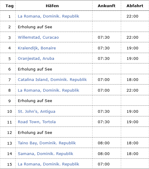 Kreuzfahrt Jahresauftakt in der Karibik: La Romana (Dominikanische Republik), Curacao, Bonaire, Aruba, Catalina Island (Dominikanische Republik), La Romana (Dominikanische Republik), Antigua, Tortola, Taino Bay (Dominikanische Republik), Samana (Dominikanische Republik), La Romana (Dominikanische Republik)