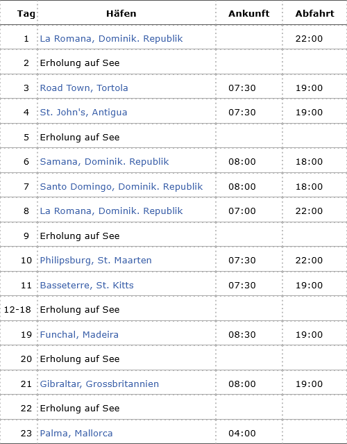 Kreuzfahrt Karibik & Auszeit auf dem Atlantik: La Romana (Dominikanische Republik), Roadtown (Tortola), Antigua, Samana (Dominikanische Republik), Santo Domingo (Dominikanische Republik), La Romana (Dominikanische Republik), St. Maarten, St. Kitts, Madeira, Gibraltar, Palma de Mallorca