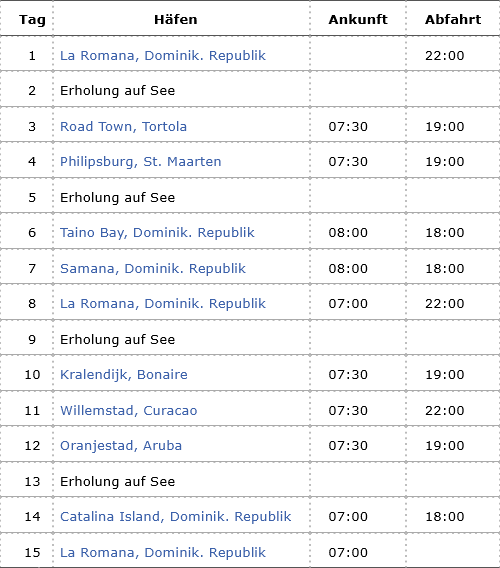 Kreuzfahrt Karibische Inselwelten: La Romana (Dominikanische Republik), Tortola, St. Maarten, Taino Bay (Dominikanische Republik), Samana (Dominikanische Republik), La Romana (Dominikanische Republik), Bonaire, Curacao, Aruba, Catalina Island (Dominikanische Republik), La Romana (Dominikanische Republik)