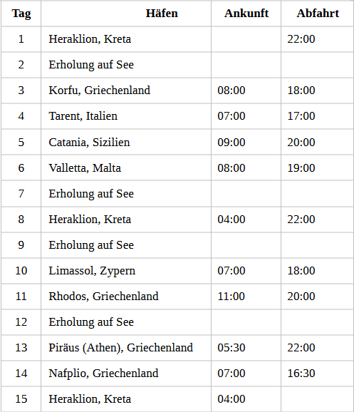 Kreuzfahrt Östliches Mittelmeer intensiv: Heraklion (Kreta), Insel Korfu, Tarent (Italien), Catania (Sizilien), La Valletta (Malta), Heraklion (Kreta), Limassol (Zypern), Insel Rhodos, Piräus (Athen), Nafplio (Griechenland), Heraklion (Kreta)