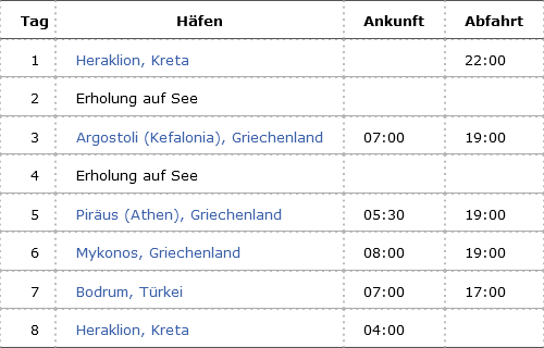 Außerdem können Sie sich auf insgesamt 2 Seetage an Bord freuen, an denen Sie das Premium Alles Inklusive-Konzept in vollen Zügen genießen können. Reisen Sie so an Bord der Mein Schiff 5 durch das östliche Mittelmeer ab Heraklion auf Kreta und freuen Sie sich auf viele abwechslungsreiche Ziele und Häfen in Griechenland und der Türkei, die intensiv bereist werden.
