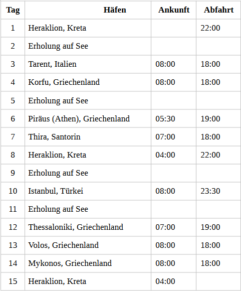 Kreuzfahrt Vielfalt des Östlichen Mittelmeers: Heraklion (Kreta), Tarent (Italien), Insel Korfu, Athen (Griechenland), Insel Santorin, Heraklion (Kreta), La Valletta (Malta), Catania (Sizilien), Athen (Griechenland), Chania (Kreta), Heraklion (Kreta)