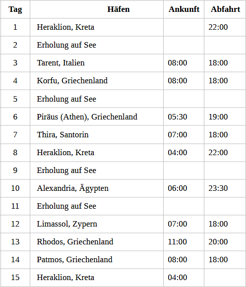 Kreuzfahrt Vielfalt des östlichen Mittelmeers: Heraklion (Kreta), Tarent (Italien), Insel Korfu, Athen (Griechenland), Insel Santorin, Heraklion (Kreta), Alexandria (Ägypten), Limassol (Zypern), Insel Rhodos, Insel Patmos, Heraklion (Kreta)