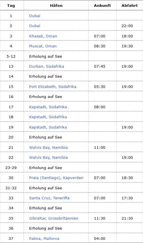 Kreuzfahrt Weltentdecker-Route ab Dubai bis Palma: Dubai, Khasab (Oman), Muscat (Oman), Durban (Südafrika), Port Elizabeth (Südafrika), Kapstadt (Südafrika), Walvis Bay (Namibia), Praia (Kapverden), Teneriffa, Gibraltar, Palma de Mallorca